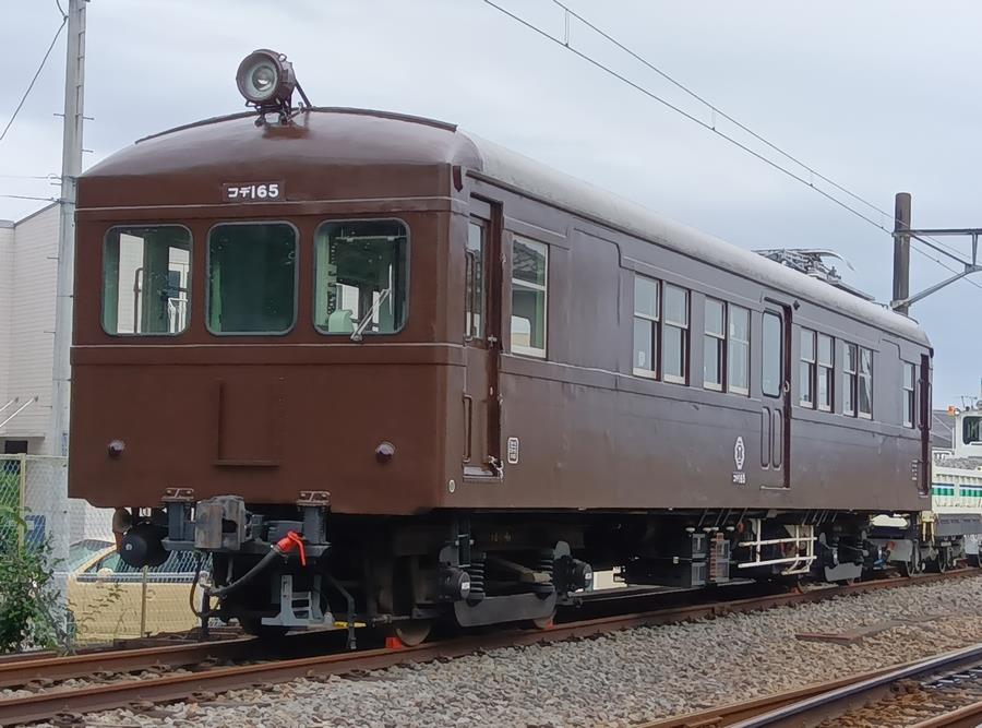 大雄山線に工事専用車として在籍し、甲種鉄道車両の牽引や夜間作業に活躍している車両です。1976年に相模鉄道より譲受されモハ165号として営業運転されていましたが1997年に引退となったコデ66号の代替として両運転台化、各機器の移設など多くの改造を施されています。車体色は工事専用車の位置付けを明確にする黄色に酒匂川をイメージする斜めの青いラインで長らく活躍していましたが、2018年に昭和初期に誕生した国鉄当時のカラーに復刻しました。